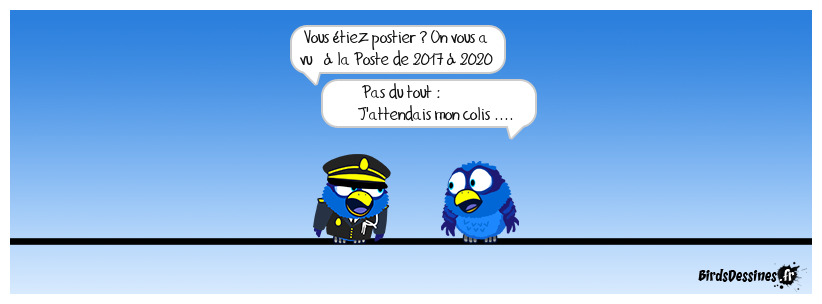 Case 1: | Case 2: Bird 1: Vous étiez postier ? On vous a vu à la Poste de 2017 à 2020 ? Bird 2: Pas du tout : J'attendais mon colis .... | Case 3: