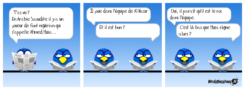 Case 1:Bird 1: T'as vu ? En Arabie Saoudite il y a un joueur de foot nigérian qui s'appelle Ahmed Musa... | Case 2: Bird 1: Il joue dans l'équipe de Al Nassr Bird 2: Et il est bon ? | Case 3: Bird 1: Oui, il paraît qu'il est le roi dans l'équipe. Bird 2: C'est là bas que Musa règne alors ?