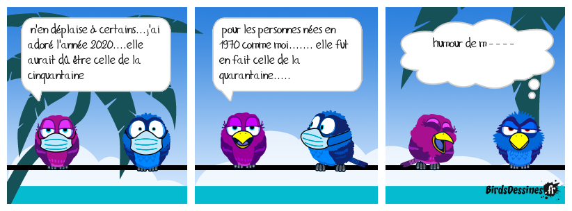 Case 1:Bird 1: n'en déplaise à certains...j'ai adoré l'année 2020....elle aurait dû être celle de la cinquantaine | Case 2: Bird 1: pour les personnes nées en 1970 comme moi....... elle fut en fait celle de la quarantaine..... | Case 3: Bird 1: humour de m - - - -