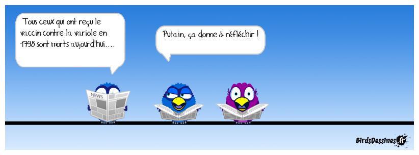 Case 1:Bird 1: Tous ceux qui ont reçu le vaccin contre la variole en 1798 sont morts aujourd'hui.... | Case 2: Bird 1: Putain, ça donne à réfléchir ! | Case 3: