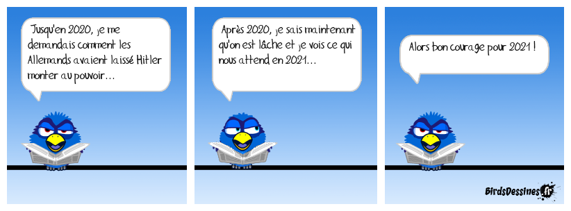 Case 1:Bird 1: Jusqu'en 2020, je me demandais comment les Allemands avaient laissé Hitler monter au pouvoir... | Case 2: Bird 1: Après 2020, je sais maintenant qu'on est lâche et je vois ce qui nous attend en 2021... | Case 3: Bird 1: Alors bon courage pour 2021 !