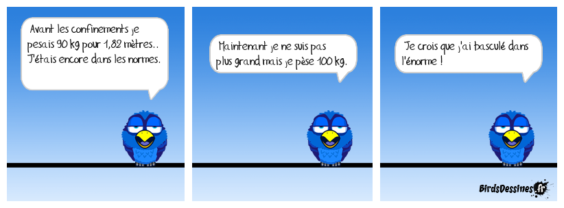 Case 1:Bird 1: Avant les confinements je pesais 90 kg pour 1,82 mètres.. J'étais encore dans les normes. | Case 2: Bird 1: Maintenant je ne suis pas plus grand mais je pèse 100 kg. | Case 3: Bird 1: Je crois que j'ai basculé dans l'énorme !