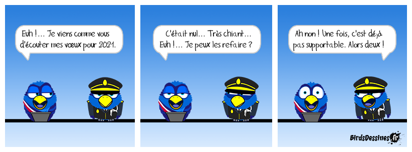 Case 1:Bird 1: Euh !... Je viens comme vous d'écouter mes vœux pour 2021. | Case 2: Bird 1: C'était nul... Très chiant... Euh !... Je peux les refaire ? | Case 3: Bird 1: Ah non ! Une fois, c'est déjà pas supportable. Alors deux !