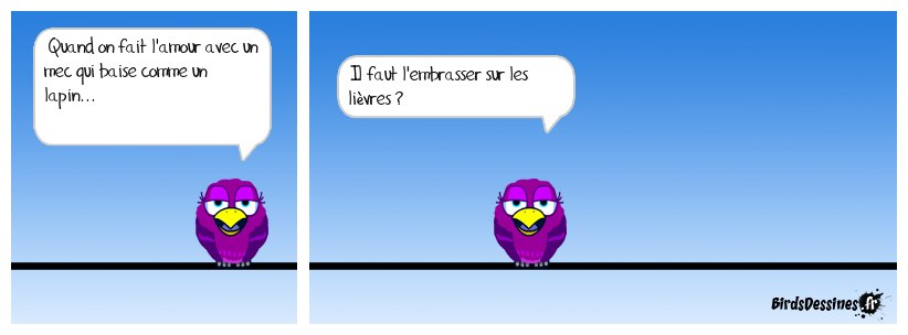 Case 1:Bird 1: Quand on fait l'amour avec un mec qui baise comme un lapin... | Case 2: Bird 1: Il faut l'embrasser sur les lièvres ? | Case 3: