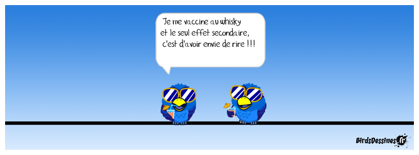 Case 1: | Case 2: Bird 1: Je me vaccine au whisky et le seul effet secondaire, c'est d'avoir envie de rire !!! | Case 3: