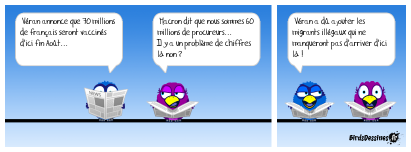 Case 1:Bird 1: Véran annonce que 70 millions de français seront vaccinés d'ici fin Août... | Case 2: Bird 1: Macron dit que nous sommes 60 millions de procureurs... Il y a un problème de chiffres là non ? | Case 3: Bird 1: Véran a dû ajouter les migrants illégaux qui ne manqueront pas d'arriver d'ici là !