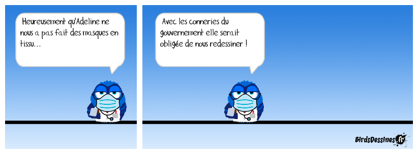 Case 1:Bird 1: Heureusement qu'Adeline ne nous a pas fait des masques en tissu... | Case 2: Bird 1: Avec les conneries du gouvernement elle serait obligée de nous redessiner ! | Case 3: