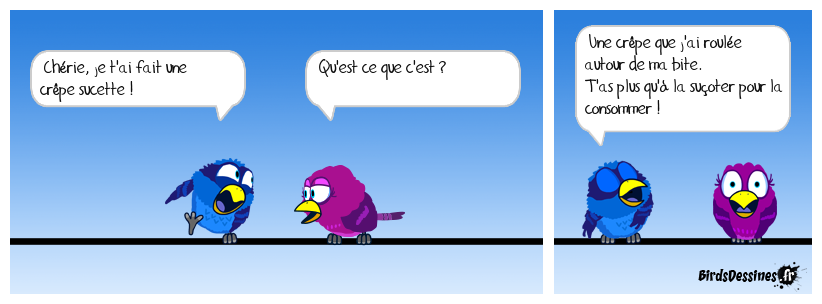 Case 1:Bird 1: Chérie, je t'ai fait une crêpe sucette ! | Case 2: Bird 1: Qu'est ce que c'est ? | Case 3: Bird 1: Une crêpe que j'ai roulée autour de ma bite. T'as plus qu'à la suçoter pour la consommer !