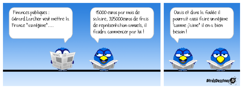 Case 1:Bird 1: Finances publiques : Gérard Larcher veut mettre la France "au régime".... | Case 2: Bird 1: 15000 euros par mois de salaire, 325000euros de frais de représentation annuels, il faudra commencer par lui ! | Case 3: Bird 1: Ouais et dans la foulée il pourrait aussi faire un régime 'comme j'aime" il en a bien besoin !