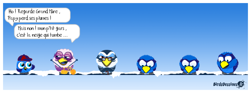 Case 1:Bird 1: Ho ! Regarde Grand Mère , Papy perd ses plumes !Bird 2: Mais non ! mon p'tit gars , c'est la neige qui tombe ... | Case 2: | Case 3: