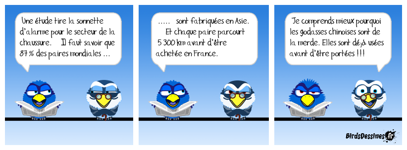 Case 1:Bird 1: Une étude tire la sonnette d’alarme pour le secteur de la chaussure. Il faut savoir que 87 % des paires mondiales ... | Case 2: Bird 1: ..... sont fabriquées en Asie. Et chaque paire parcourt 5 300 km avant d’être achetée en France. | Case 3: Bird 1: Je comprends mieux pourquoi les godasses chinoises sont de la merde. Elles sont déjà usées avant d’être portées !!!