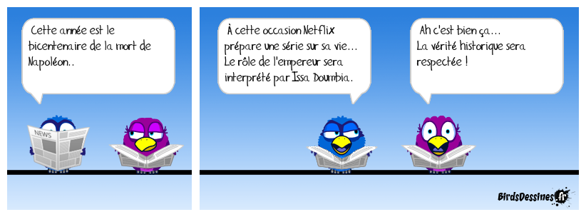 Case 1:Bird 1: Cette année est le bicentenaire de la mort de Napoléon.. | Case 2: Bird 1: À cette occasion Netflix prépare une série sur sa vie... Le rôle de l'empereur sera interprété par Issa Doumbia. | Case 3: Bird 1: Ah c'est bien ça... La vérité historique sera respectée !