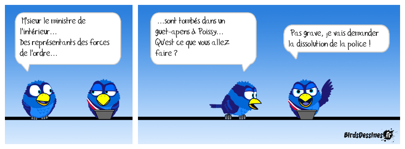 Case 1:Bird 1: M'sieur le ministre de l'intérieur... Des représentants des forces de l'ordre... | Case 2: Bird 1: ...sont tombés dans un guet-apens à Poissy... Qu'est ce que vous allez faire ? | Case 3: Bird 1: Pas grave, je vais demander la dissolution de la police !