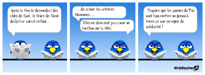 Case 1:Bird 1: Après la finale du mondial des clubs de foot, le frère de l'émir du Qatar aurait refusé.. | Case 2: Bird 1: ... de saluer les arbitres féminines.... Bird 2: Elles ne devaient pas avoir un torchon sur la tête. | Case 3: Bird 1: J'espère que les joueurs du PSG vont tous mettre un genou à terre ce soir en signe de solidarité !