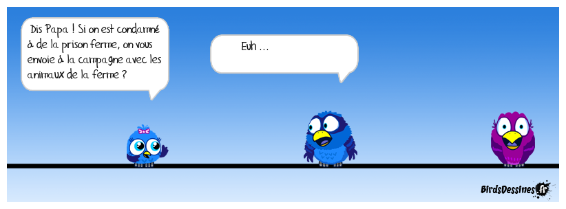 Case 1:Bird 1: Dis Papa ! Si on est condamné à de la prison ferme, on vous envoie à la campagne avec les animaux de la ferme ? | Case 2: Bird 1: Euh ... | Case 3: