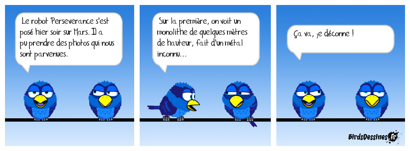 Case 1:Bird 1: Le robot Perseverance s'est posé hier soir sur Mars. Il a pu prendre des photos qui nous sont parvenues. | Case 2: Bird 1: Sur la première, on voit un monolithe de quelques mètres de hauteur, fait d'un métal inconnu... | Case 3: Bird 1: Ça va, je déconne !