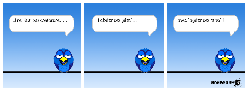 Case 1:Bird 1: Il ne faut pas confondre..... | Case 2: Bird 1: "habiter des gites"... | Case 3: Bird 1: avec "agiter des bites" !