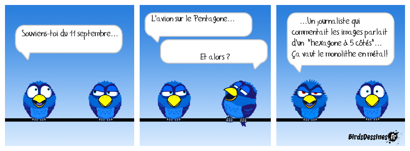 Case 1:Bird 1: Souviens-toi du 11 septembre... | Case 2: Bird 1: L'avion sur le Pentagone... Bird 2: Et alors ? | Case 3: Bird 1: ...Un journaliste qui commentait les images parlait d'un "hexagone à 5 côtés"... Ça vaut le monolithe en métal!