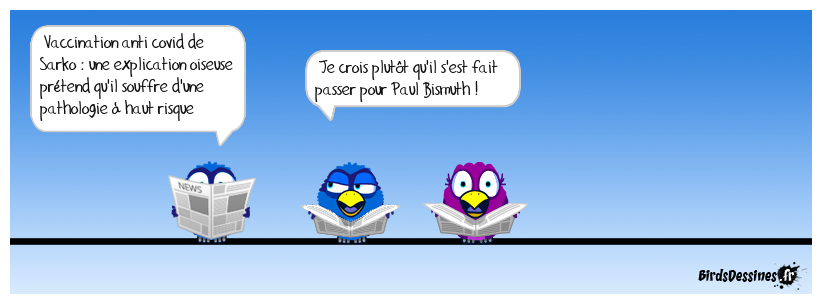 Case 1:Bird 1: Vaccination anti covid de Sarko : une explication oiseuse prétend qu'il souffre d'une pathologie à haut risque | Case 2: Bird 1: Je crois plutôt qu'il s'est fait passer pour Paul Bismuth ! | Case 3: