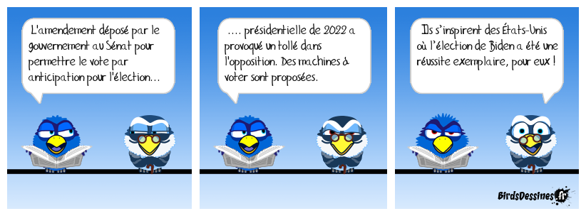 Case 1:Bird 1: L'amendement déposé par le gouvernement au Sénat pour permettre le vote par anticipation pour l'élection... | Case 2: Bird 1: .... présidentielle de 2022 a provoqué un tollé dans l'opposition. Des machines à voter sont proposées. | Case 3: Bird 1: Ils s’inspirent des Ètats-Unis où l’élection de Biden a été une réussite exemplaire, pour eux !
