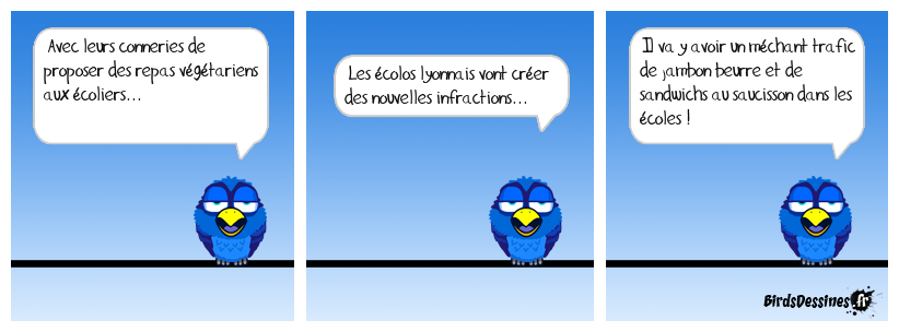 Case 1:Bird 1: Avec leurs conneries de proposer des repas végétariens aux écoliers... | Case 2: Bird 1: Les écolos lyonnais vont créer des nouvelles infractions... | Case 3: Bird 1: Il va y avoir un méchant trafic de jambon beurre et de sandwichs au saucisson dans les écoles !
