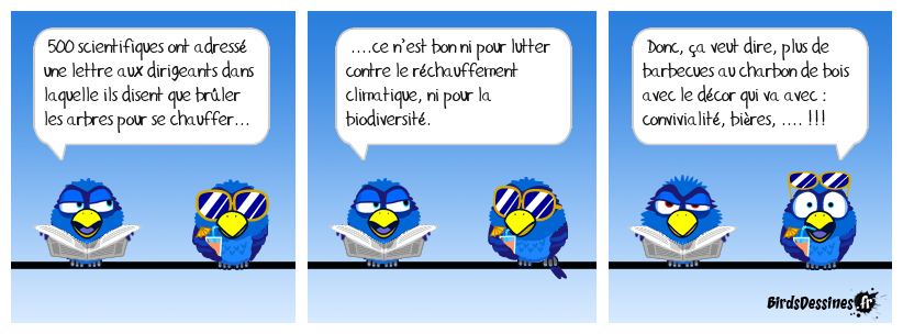 Case 1:Bird 1: 500 scientifiques ont adressé une lettre aux dirigeants dans laquelle ils disent que brûler les arbres pour se chauffer... | Case 2: Bird 1: ....ce n’est bon ni pour lutter contre le réchauffement climatique, ni pour la biodiversité. | Case 3: Bird 1: Donc, ça veut dire, plus de barbecues au charbon de bois avec le décor qui va avec : convivialité, bières, .... !!!