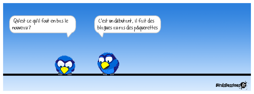 Case 1:Bird 1: Qu'est ce qu'il fout en bas le nouveau ? | Case 2: Bird 1: C'est un débutant, il fait des blagues au ras des pâquerettes | Case 3: