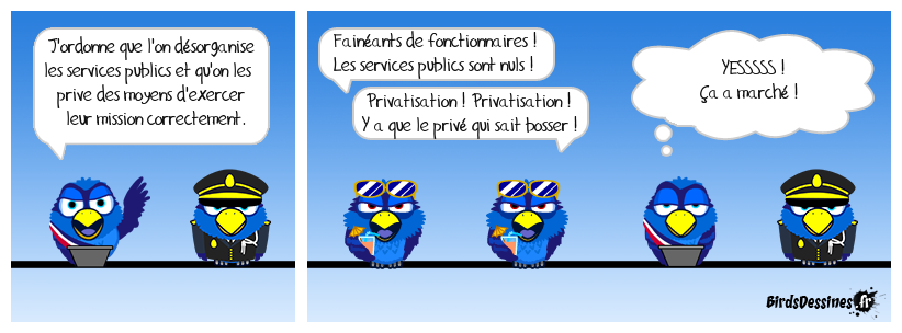 Case 1:Bird 1: J'ordonne que l'on désorganise les services publics et qu'on les prive des moyens d'exercer leur mission correctement. | Case 2: Bird 1: Fainéants de fonctionnaires ! Les services publics sont nuls ! Bird 2: Privatisation ! Privatisation ! Y a que le privé qui sait bosser ! | Case 3: Bird 1: YESSSSS ! Ça a marché !