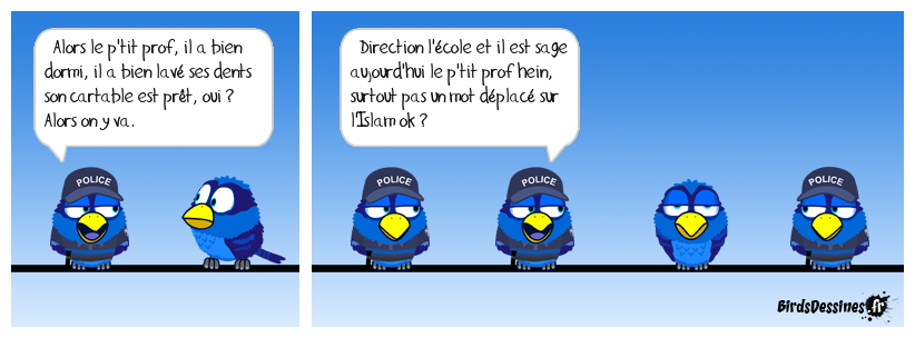 Case 1:Bird 1: Alors le p'tit prof, il a bien dormi, il a bien lavé ses dents son cartable est prêt, oui ? Alors on y va. | Case 2: Bird 1: Direction l'école et il est sage aujourd'hui le p'tit prof hein, surtout pas un mot déplacé sur l'Islam ok ? | Case 3: