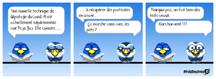 Case 1:Bird 1: Une nouvelle technique de dépistage du Covid-19 est actuellement expérimentée aux Pays-Bas. Elle consiste.... | Case 2: Bird 1: .... à récupérer des particules en criant. Bird 2: Ça marche aussi avec les pets ? | Case 3: Bird 1: Pourquoi pas, on fait bien des tests anaux. Bird 2: Alors bon vent !!!