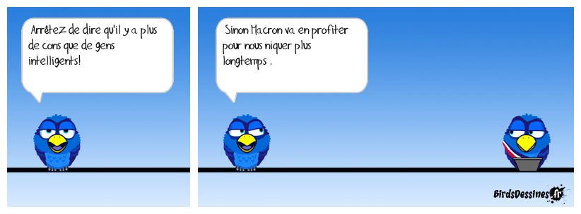 Case 1:Bird 1: Arrêtez de dire qu'il y a plus de cons que de gens intelligents! | Case 2: Bird 1: Sinon Macron va en profiter pour nous niquer plus longtemps . | Case 3: