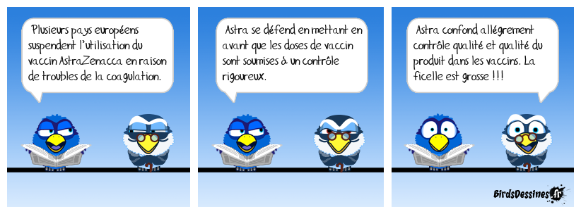 Case 1:Bird 1: Plusieurs pays européens suspendent l’utilisation du vaccin AstraZenacca en raison de troubles de la coagulation. | Case 2: Bird 1: Astra se défend en mettant en avant que les doses de vaccin sont soumises à un contrôle rigoureux. | Case 3: Bird 1: Astra confond allégrement contrôle qualité et qualité du produit dans les vaccins. La ficelle est grosse !!!