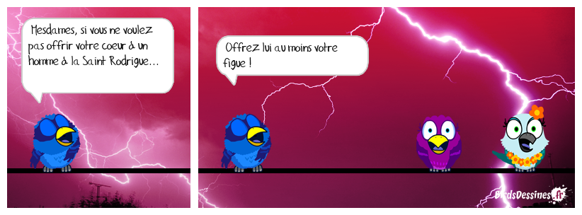 Case 1:Bird 1: Mesdames, si vous ne voulez pas offrir votre coeur à un homme à la Saint Rodrigue... | Case 2: Bird 1: Offrez lui au moins votre figue ! | Case 3: