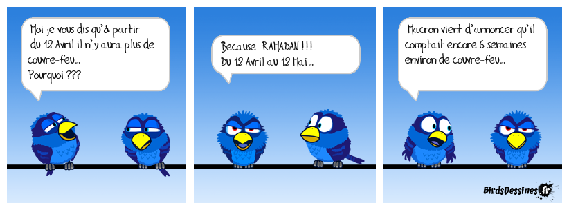 Case 1:Bird 1: Moi je vous dis qu’à partir du 12 Avril il n’y aura plus de couvre-feu… Pourquoi ??? | Case 2: Bird 1: Because RAMADAN !!! Du 12 Avril au 12 Mai… | Case 3: Bird 1: Macron vient d’annoncer qu’il comptait encore 6 semaines environ de couvre-feu…