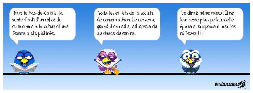 Case 1:Bird 1: Dans le Pas-de-Calais, la vente flash d’un robot de cuisine vire à la cohue et une femme a été piétinée. | Case 2: Bird 1: Voilà les effets de la société de consommation. Le cerveau, quand il en reste, est descendu au niveau du ventre. | Case 3: Bird 1: Je dirais même mieux. Il ne leur reste plus que la moelle épinière, uniquement pour les réflexes !!!