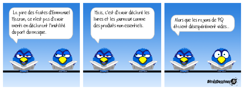 Case 1:Bird 1: La pire des fautes d'Emmanuel Macron, ce n'est pas d'avoir menti en déclarant l'inutilité du port du masque. | Case 2: Bird 1: Mais, c'est d'avoir déclaré les livres et les journaux comme des produits non essentiels. | Case 3: Bird 1: Alors que les rayons de PQ étaient désespérément vides..