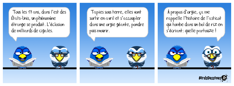 Case 1:Bird 1: Tous les 17 ans, dans l’est des Ètats-Unis, un phénomène étrange se produit. L’éclosion de milliards de cigales. | Case 2: Bird 1: Tapies sous terre, elles vont sortir en avril et s’accoupler dans une orgie géante, pondre puis mourir. | Case 3: Bird 1: À propos d’orgie, ça me rappelle l’histoire de l’asticot qui tombe dans un bol de riz en s’écriant: quelle partouze !
