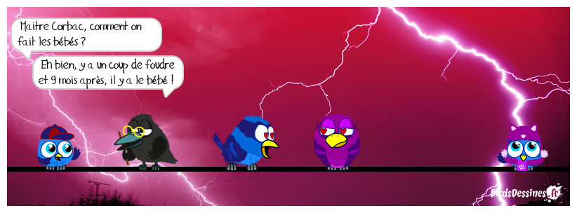 Case 1:Bird 1: Maitre Corbac, comment on fait les bébés ?Bird 2: Eh bien, y a un coup de foudre et 9 mois après, il y a le bébé ! | Case 2: | Case 3: