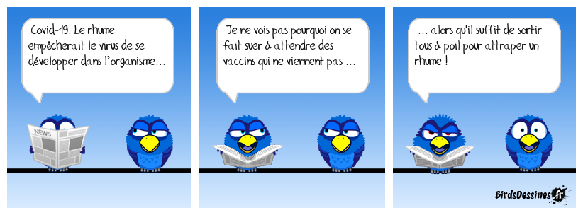 Case 1:Bird 1: Covid-19. Le rhume empêcherait le virus de se développer dans l’organisme... | Case 2: Bird 1: Je ne vois pas pourquoi on se fait suer à attendre des vaccins qui ne viennent pas ... | Case 3: Bird 1: ... alors qu'il suffit de sortir tous à poil pour attraper un rhume !