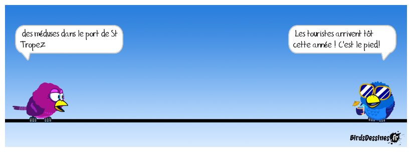 Case 1:Bird 1: des méduses dans le port de St Tropez | Case 2: | Case 3: Bird 1: Les touristes arrivent tôt cette année ! C'est le pied!