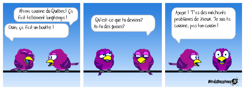 Case 1:Bird 1: Ah ma cousine du Québec! Ça fait tellement longtemps !Bird 2: Ouin, ça fait un boutte ! | Case 2: Bird 1: Qu’est-ce que tu deviens? As-tu des gosses? | Case 3: Bird 1: Ayoye ! T’as des méchants problèmes de zieux. Je suis ta cousine, pas ton cousin !