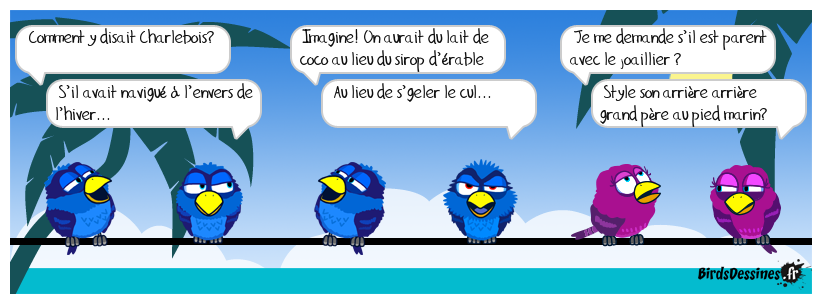 Case 1:Bird 1: Comment y disait Charlebois?Bird 2: S’il avait navigué à l’envers de l’hiver... | Case 2: Bird 1: Imagine! On aurait du lait de coco au lieu du sirop d’érable Bird 2: Au lieu de s’geler le cul... | Case 3: Bird 1: Je me demande s’il est parent avec le joaillier ? Bird 2: Style son arrière arrière grand père au pied marin?