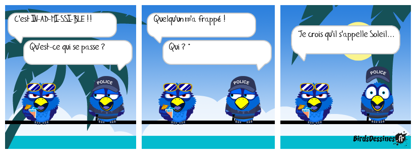 Case 1:Bird 1: C'est IN-AD-MI-SSI-BLE !!Bird 2: Qu'est-ce qui se passe ? | Case 2: Bird 1: Quelqu'un m'a frappé ! Bird 2: Qui ? * | Case 3: Bird 1: Je crois qu'il s'appelle Soleil...