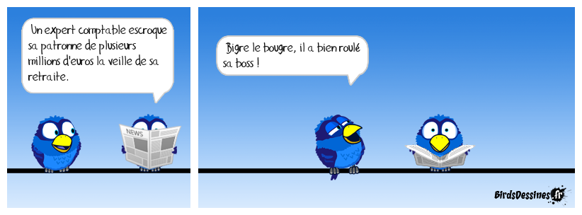 Case 1:Bird 1: Un expert comptable escroque sa patronne de plusieurs millions d'euros la veille de sa retraite. | Case 2: Bird 1: Bigre le bougre, il a bien roulé sa boss ! | Case 3: