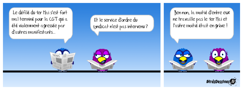 Case 1:Bird 1: Le défilé du 1er Mai s'est fort mal terminé pour la CGT qui a été violemment agressée par d'autres manifestants.. | Case 2: Bird 1: Et le service d'ordre du syndicat n'est pas intervenu ? | Case 3: Bird 1: Ben non, la moitié d'entre eux ne travaille pas le 1er Mai et l'autre moitié était en grève !