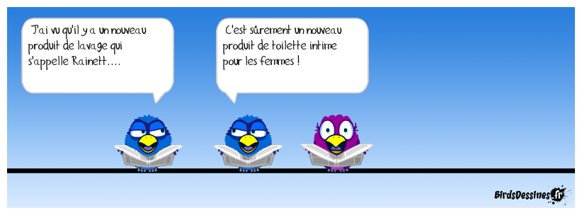 Case 1:Bird 1: J'ai vu qu'il y a un nouveau produit de lavage qui s'appelle Rainett.... | Case 2: Bird 1: C'est sûrement un nouveau produit de toilette intime pour les femmes ! | Case 3: