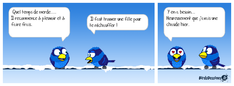 Case 1:Bird 1: Quel temps de merde.... Il recommence à pleuvoir et à faire frais. | Case 2: Bird 1: Il faut trouver une fille pour te réchauffer ! | Case 3: Bird 1: Y en a besoin... Heureusement que j'avais une chaude hier.