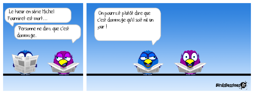 Case 1:Bird 1: Le tueur en série Michel Fourniret est mort...Bird 2: Personne ne dira que c'est dommage. | Case 2: Bird 1: On pourrait plutôt dire que c'est dommage qu'il soit né un jour ! | Case 3: