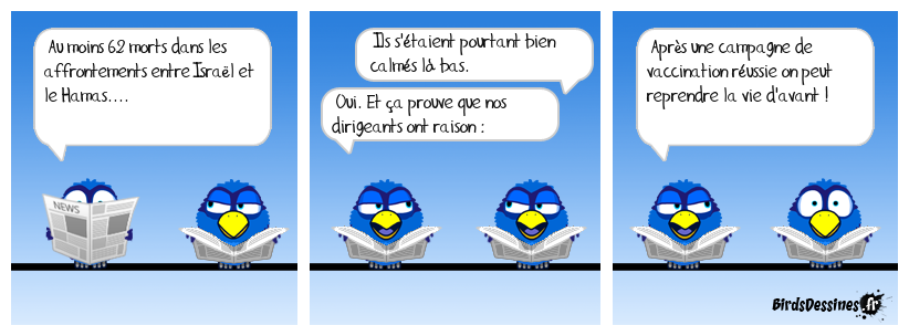 Case 1:Bird 1: Au moins 62 morts dans les affrontements entre Israël et le Hamas.... | Case 2: Bird 1: Ils s'étaient pourtant bien calmés là bas. Bird 2: Oui. Et ça prouve que nos dirigeants ont raison : | Case 3: Bird 1: Après une campagne de vaccination réussie on peut reprendre la vie d'avant !