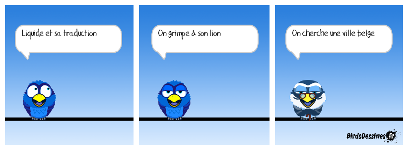 Case 1:Bird 1: Liquide et sa traduction | Case 2: Bird 1: On grimpe à son lion | Case 3: Bird 1: On cherche une ville belge